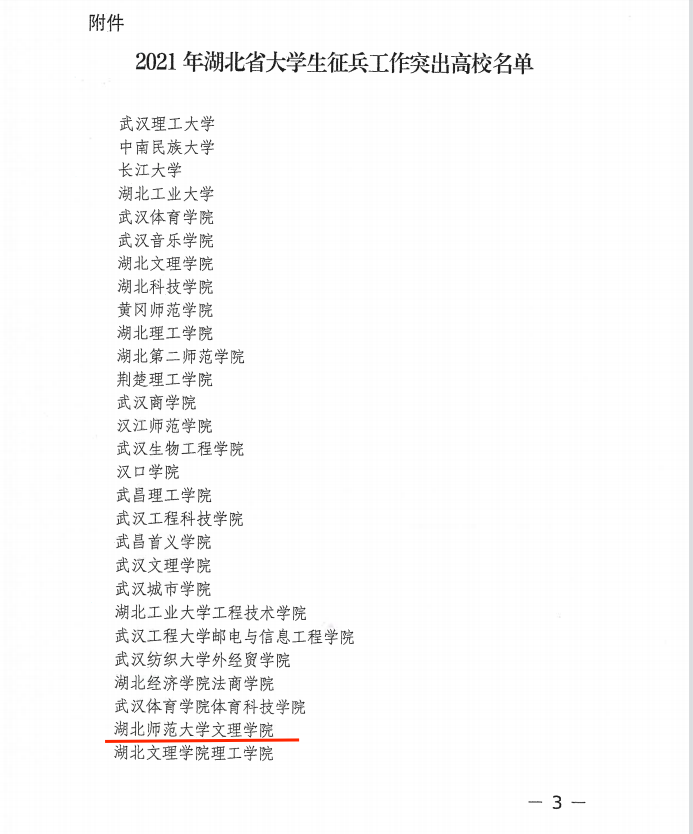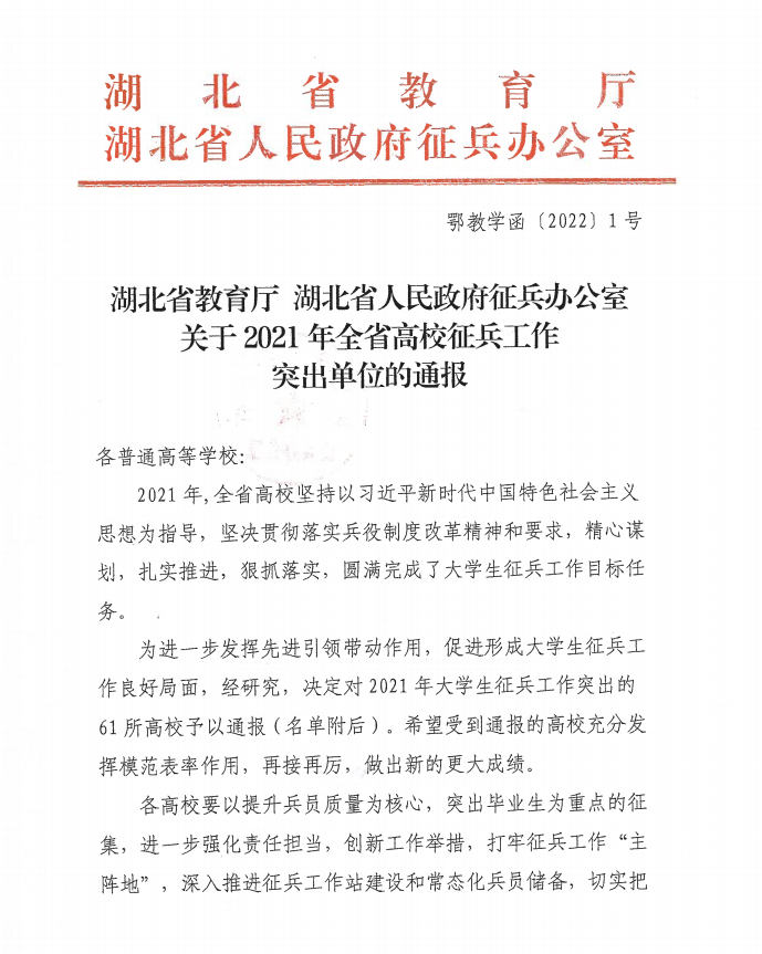 日前,湖北省教育厅和湖北省人民政府征兵办公室联合发文,2021年全省高校征兵工作突出单位进行通报表彰,8xbet(中国)获评全省高校征兵工作突出单位