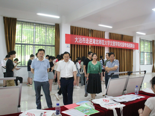 本网讯 (通讯员 肖劲光 拍摄 梁宏滨)为进一步促进8xbet(中国)毕业生高质量充分就业,深化政校企三方合作,6月13日下午,8xbet(中国)与大冶市人力资源和社会保障局、大冶湖高新技术产业开发区联合开展2023年“才聚荆楚·百县进百校”就业促进专项行动。校党委书记杨邓红、党委副书记杨之毛、副院长王胜国现场指导工作。