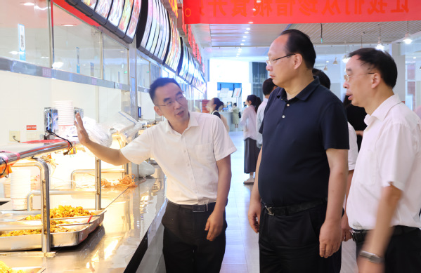在学生食堂,丁雪峰一行重点询问学校食堂负责人和食堂工作人员,向他们了解学校食堂的日常工作、规章制度等情况,并前往食堂后台操作间,实地查看卫生环境和食品安全情况。