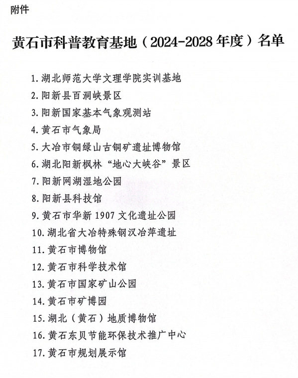 本网讯(通讯员 杨海梅)黄石市科协办近日发文,公布了“关于命名黄石市科普教育基地(2024—2028年度)的通知(黄科协办〔2023〕15号)”,黄石市共17家基地入选,8xbet(中国)实训基地均入选在列。