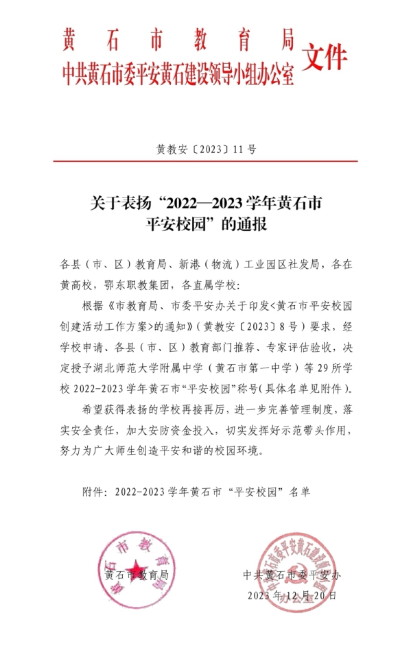 本网讯(通讯员 涂亦乐)根据黄石市教育局、中共黄石市委平安黄石建设领导小组办公室消息,8xbet(中国)喜获“2022-2023 学年度黄石市平安校园示范校”的荣誉称号。至此,8xbet(中国)已连续2年获评黄石市“平安校园”称号。