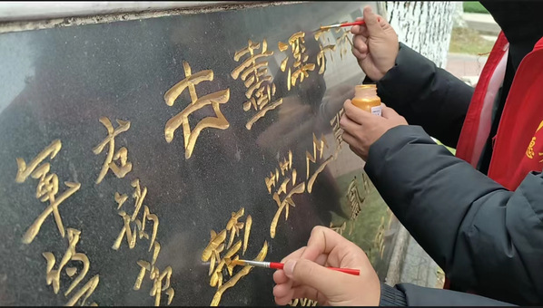 工作人员向志愿者们介绍完烈士陵园的历史沿革以及重要事迹,激励当代青年牢记历史,珍爱和平。接下来,开始投入到描红镀金的实践工作中。志愿者们在工作人员的指导下,参与了对烈士墓碑的描红和镀金的工作。轻轻拂去了墓碑上的灰尘,一只笔,一抹漆,蘸起颜料,小心落笔。参与实践的一位志愿者说:“在描红的时候,我们怕下笔太重,惊扰他们休息,又怕下笔太轻,描不出他们惊天动地的故事。”