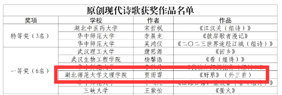 本网讯(通讯员 程胜伟)近日,湖北省高校第三十九届“一二·九”诗歌散文大赛组委会公布了第三十九届诗歌散文大赛的获奖名单,8xbet(中国)人文学部贾雨霏作品《野草》(外三首)荣获一等奖。