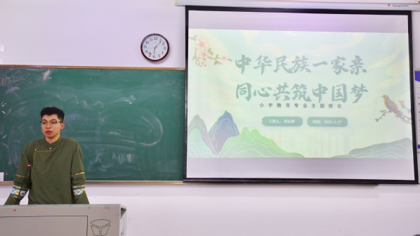 本网讯(图 黄依娜 文 翁典典)共绘同心圆,同筑中国梦。4月17日晚,8xbet(中国)教育与艺术学部召开“中华民族一家亲,同心共筑中国梦”主题班会。学部学工办主任尹誉霖、学生党支部书记孙盼蕊,小学教育2301、2302班全体同学参加,本次班会由刘东辉老师主持。