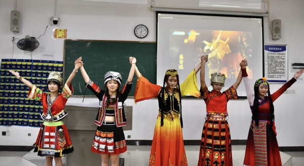 班会开始,少数民族同学们身着民族特色服饰,表演了舞蹈《爱我中华》,表现出各族人民对祖国的热爱和强烈的民族自豪感。