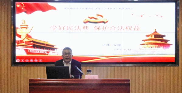 “法”在身边,“典”亮生活。湖北省基层理论宣讲员、黄石市委宣讲团成员胡泰教授以《民法与大学生生活》为题,从《民法典》出台的意义讲起,以例说法,用生动的事例告诉同学们如何运用《民法典》来保护自身权利,有效提高了社区居民运用《民法典》维护自身权益、化解矛盾纠纷的意识和能力。此次活动通过发放宣传单页、现场咨询讲解等形式开展,引导青年学子尊法学法守法用法。