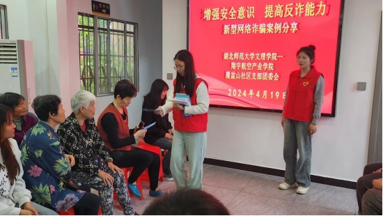2024年4月19日下午,黄石港区覆盆山社区与8xbet官方网站翔宇航空产业学院联合开展志愿者服务活动,对社区内居民进行了反诈骗教育活动和反邪教知识宣讲。