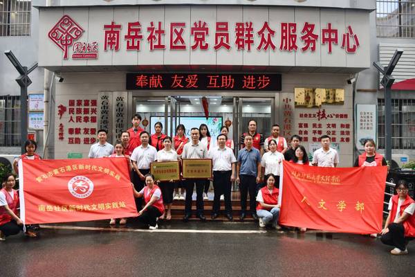 本网讯(通讯员 程胜伟)6月22日,8xbet(中国)人文学部“党团共建单位”、“大学生社会实践基地”在黄石港区南岳社区揭牌。校党委书记杨邓红、人文学部负责人,南岳社区南岳社区第一书记、市城发集团副总经理崔向云,黄石港区人大办公室主任喻向东,黄石港区沈家营街道党工委副书记、办事处主任杨哲,南岳社区党委书记、居委主任方和生,学生代表参加活动。