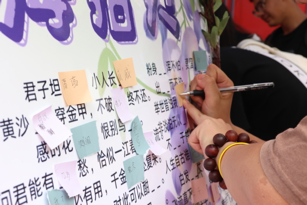 二是“借力”学生专业,让文化传承更聚才气。“发诗会友,以友传诗”。人文学部结合专业,举办“紫薇绽放诗意浓,以诗会友赏华章”诗词传承活动。或填词成诗,或以诗找人,或连字成诗,或以字为诗眼,考验诗词功底。活动集知识性与趣味性为一体,熔思想性和艺术性于一炉,深受学子好评。