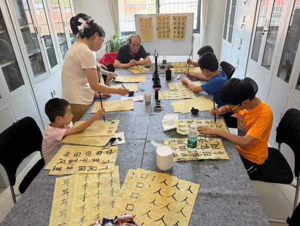 在民主社区,毛笔书法课正在如火如荼开展。书法志愿者老师从最基本的书写姿势、执笔方法等技巧进行教学,边示范讲解毛笔字起笔、运笔、收笔要领,边对小朋友的握笔姿势和坐姿进行细心指导。小朋友们认真听课,一笔一画、一撇一捺,反复练习,劲头十足。