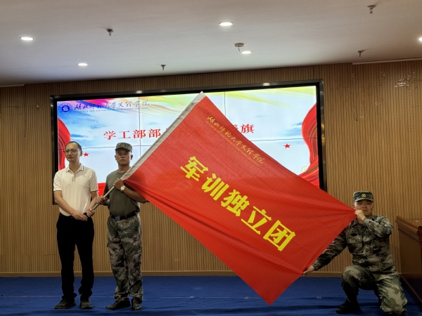 学工部部长汪崇文为军训独立团授旗,独立团团长接旗。