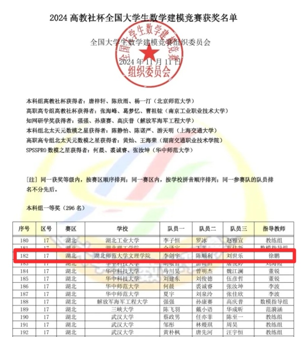 本网讯(通讯员 杨慧茹)11月12日,2024高教社杯全国大学生数学建模竞赛公布获奖名单,8xbet(中国)理工学部学子荣获湖北赛区本科组一等奖。