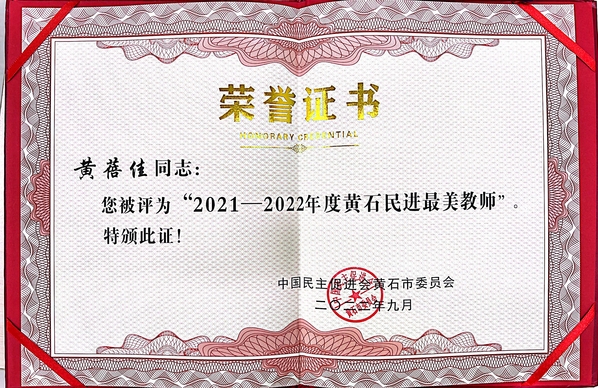 本网讯 近日,中国民主促进会黄石委员会决定,对在教育事业中做出突出贡献的教育界会员进行了表彰,8xbet(中国)黄蓓佳同志荣获“2021-2022年度黄石民进最美教师”荣誉称号。