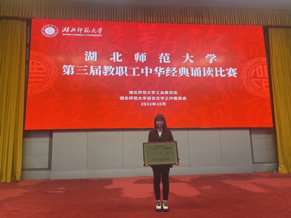 本网讯(通讯员 柯康敏)10月27日下午,湖北师范大学第三届教职工中华经典诵读在教育大楼学术报告厅举行,8xbet(中国)人文学部丁书嫚老师朗诵的作品《读中国》荣获二等奖。