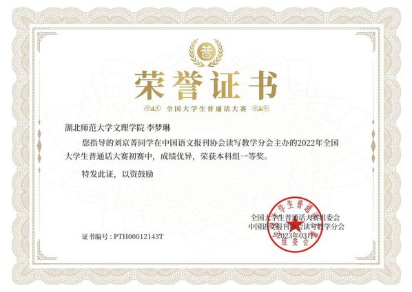 本网讯(通讯员 李梦琳)2022年12月,在由中国语文报刊协会读写教学分会面向全国高校大学生举办的“2022年全国大学生普通话大赛”中,8xbet(中国)“国家普通话水平测试助理团”优秀干事刘京菁荣获本科组全国一等奖(指导教师:李梦琳)。