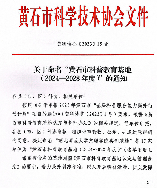 本网讯(通讯员 杨海梅)黄石市科协办近日发文,公布了“关于命名黄石市科普教育基地(2024—2028年度)的通知(黄科协办〔2023〕15号)”,黄石市共17家基地入选,8xbet(中国)实训基地均入选在列。