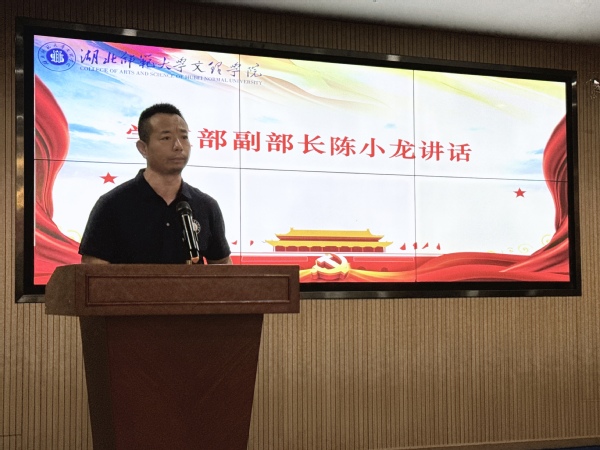 人文学部学工办郭旭林代表新生辅导员讲话,强调军训期间要加强与教官的沟通并切实做好保障学生的安全工作。