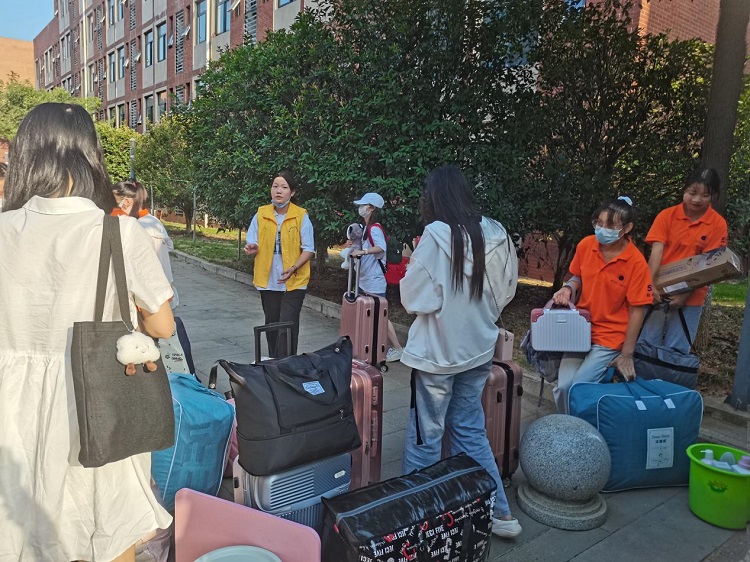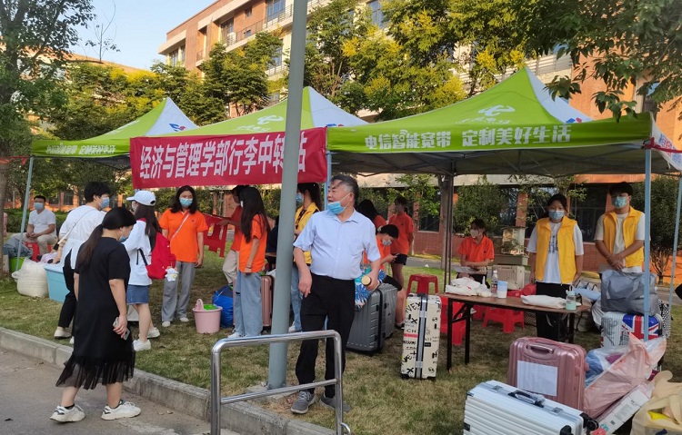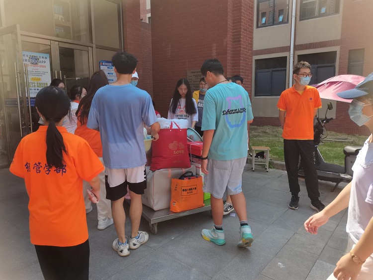 疫情防控尤当紧,为迎接新生的到来,8xbet(中国)做足了准备。学校在火车站、汽车站设立接待点,安排了大巴车将新生与家长送至学校;在校内迎新联合办公室内设置了各学部迎新点,在2号实验楼与行政楼之间设置了各学部行李中转站。在经管学部主任商树松的领导下,学部在校内各点均配备了迎新教师和志愿者。学生和家长一到达学校,校门口的志愿者们便立刻上前迎接,引导他们去迎新联合办公室学部迎新点办理报到手续,办理完手续再帮助新生把行李搬运上接驳车送至宿舍楼,宿舍楼下早已有志愿者们等候,帮助新生将行李点对点搬至各宿舍。经管学部的志愿者们身着亮丽的橘红色志愿者服装,他们不怕炎热,不辞辛苦,校门口、学部迎新点、行李中转站、学生宿舍楼下等地方都流动着他们忙碌的身影,那一抹橘红色为学校增添了一道亮丽的风景线。