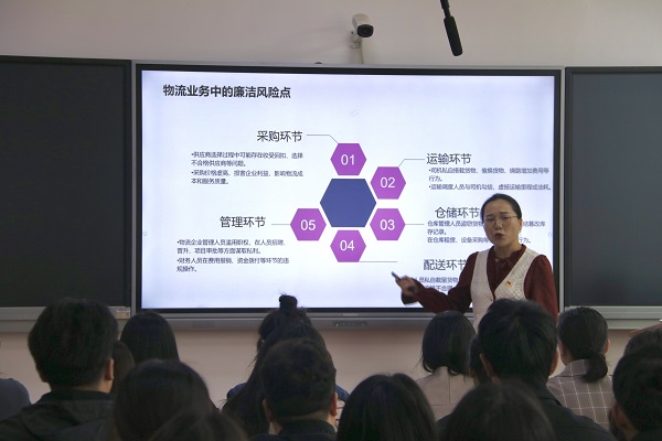 1113下午220,经济与管理学部教工党支部组织开展了“廉洁文化微课堂”系列活动之第讲:廉洁于心,物流于行。主讲人为物流管理专任教师罗尹老师,学部全体党员教师及物流管理2202班学生参加。
