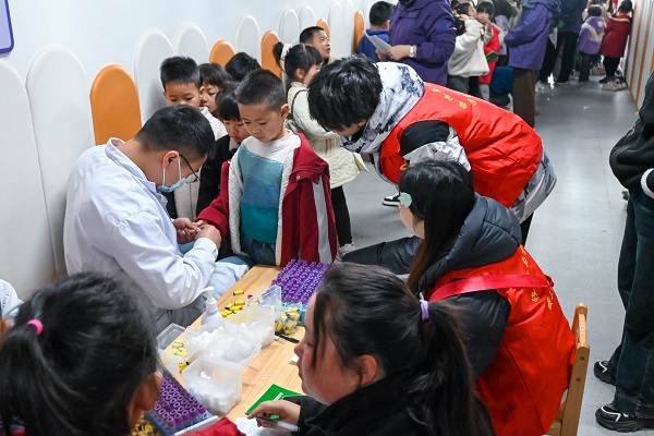 在体检环节中,党员志愿者与医护人员通力协作,以高度的责任感和专业的服务水准,全程保障身高体重测量、视力筛查、采血等项目的顺利实施,通过耐心引导和情绪安抚,确保体检工作高效有序开展。