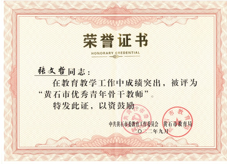 黄石市优秀青年骨干教师——张文哲