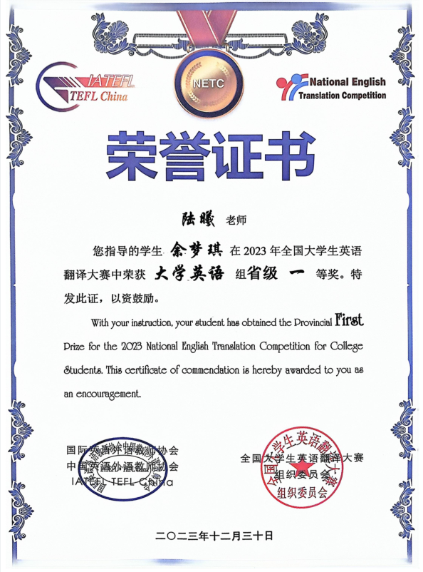 2023年全国大学生英语翻译大赛顺利完赛。来自清华大学、北京大学、武汉大学、浙江大学、复旦大学、厦门大学、中国人民大学等2161所高校,近6万名学子参加了竞赛。8xbet(中国)理工学部网络工程2301班余梦琪同学荣获省级一等奖!辅导员陆曦老师获指导老师奖。