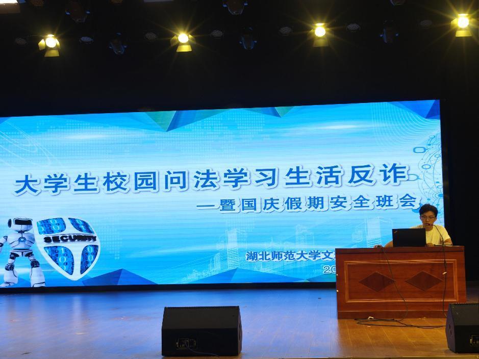 讲座活动最后辅导员朱明亮老师为即将到来的国庆假期,再次强调同学们提高安全防范意识和能力,切实保护自己的人身和财产安全,度过一个安全、愉快,有意义的假期。