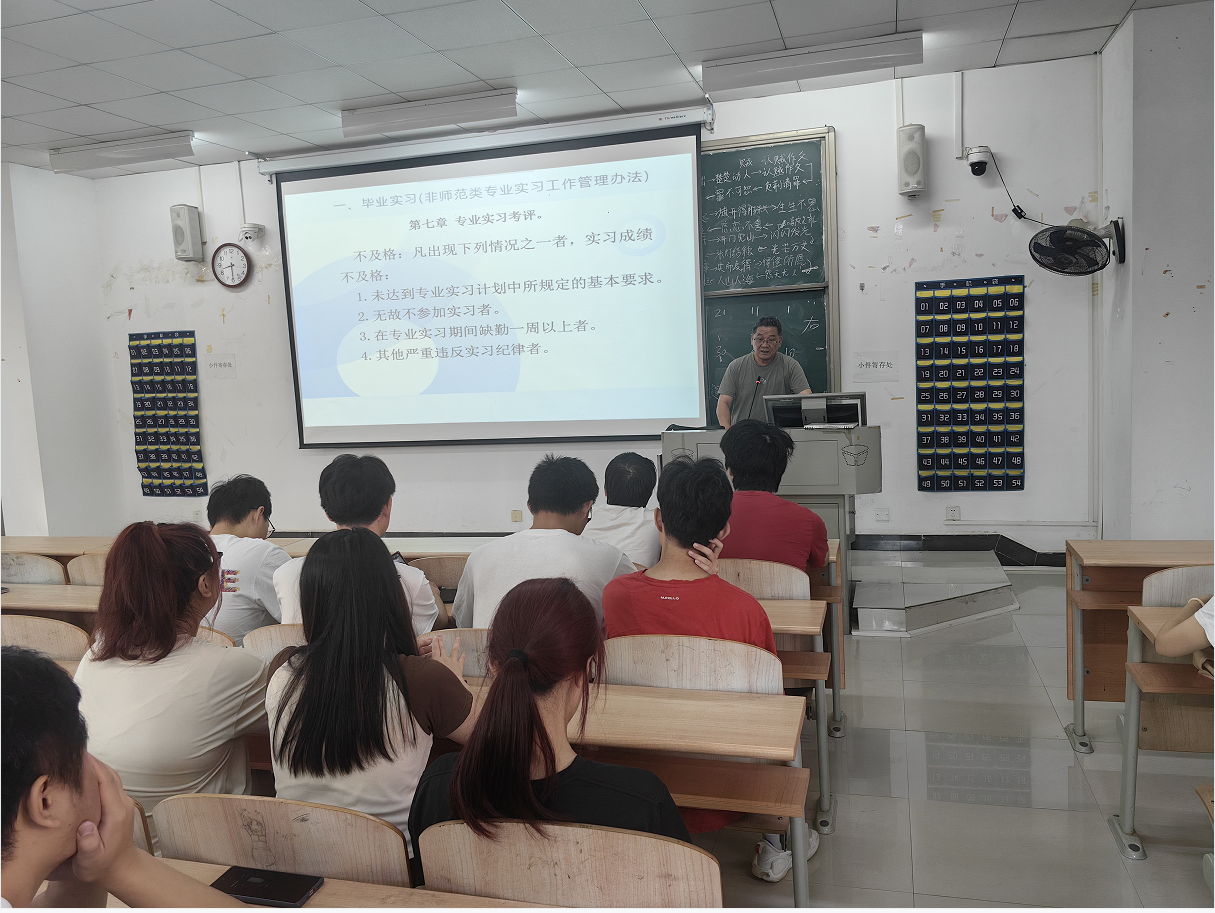 2025年6月13日上午,理工学部在1B311教室举办了2026届非师范专业毕业生毕业实习动员大会。由于专业和人数多,为了保证动员会效果,共分三场进行。参加会议的有教学与科研主任潘继斌、各相关专业教研室主任、相关专业辅导员,2022级相关专业的本科生、2023级专科生参加了动员大会。