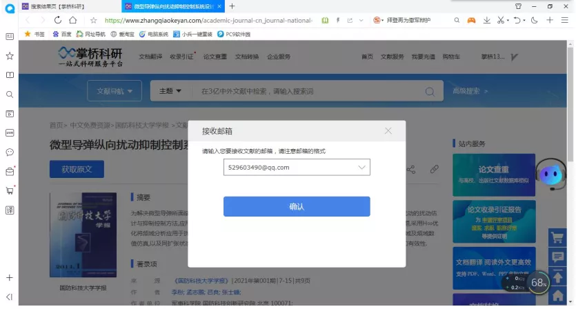 步骤一:在被收索文献的详情页面中,点击文献标题下方【获取原文】按键,弹出“接收邮箱”弹窗,输入正确的邮箱地址后,点击【确认】 按键。