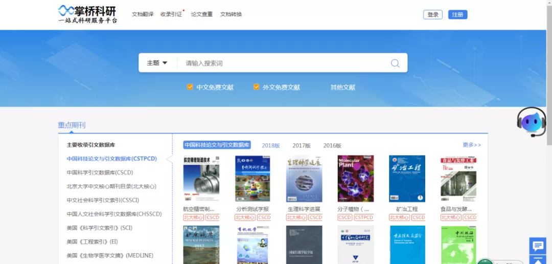 掌桥科研中文免费文献数据库是掌桥科研面向教育与研究机构推出的免费服务数据库。该文献数据库目前收录了超过1200种中文期刊,其中核心期刊超过900种,论文总数量超过800万篇,时间最早可追溯至1950年。学科覆盖自然科学、工程与技术科学、农业科学、医药科学及管理科学,数据月度更新,本数据库论文全文由国家工程技术数字图书馆提供。