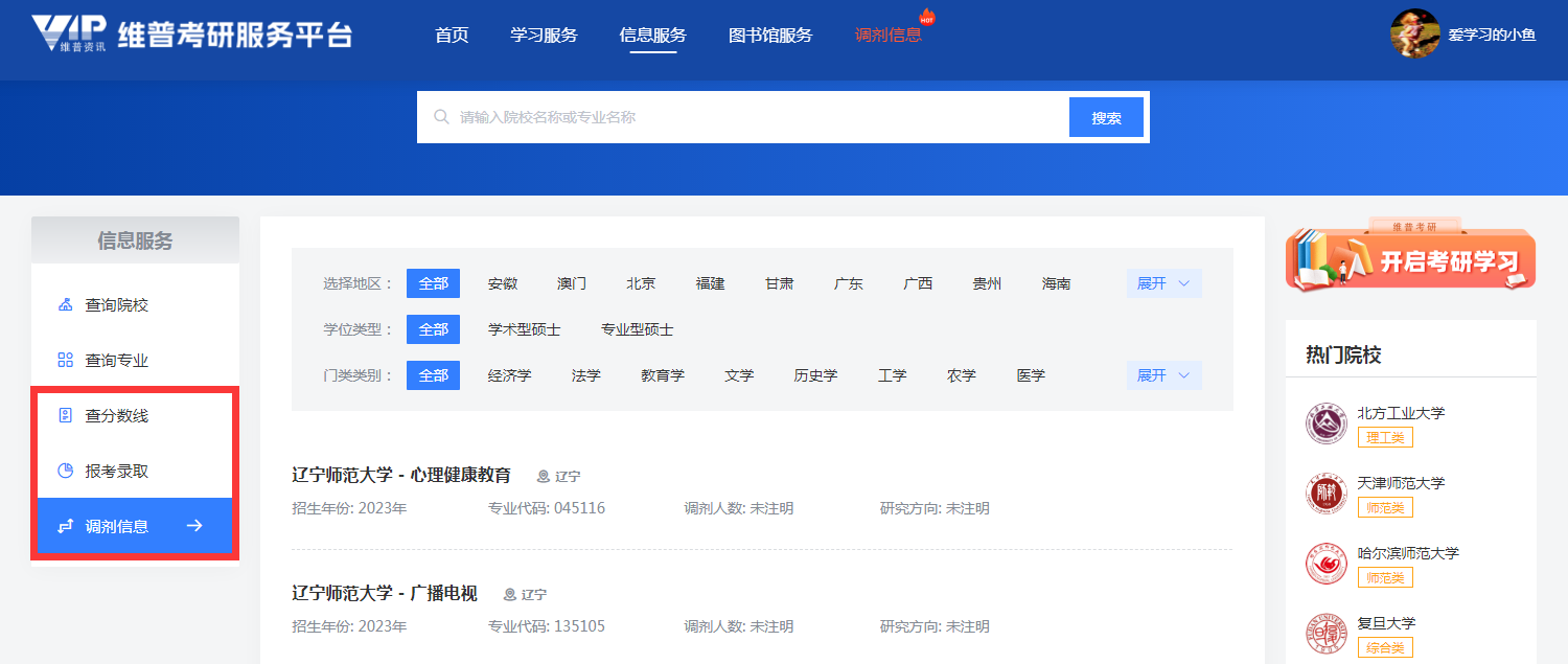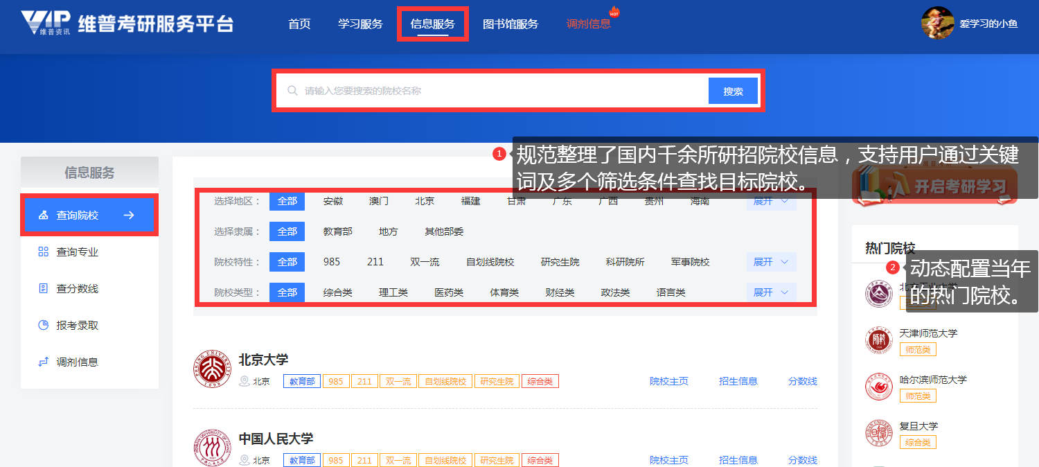 新平台的“信息服务”版块,涵盖的资讯信息贯穿了考研前后整条时间线的重要节点,资讯类型分类全面且规范合理,内容包含有关考研大环境的“热点资讯”,如国家政策、考研动态、国家分数线,以及涉及具体院校的“院校招生”信息,如院校公告、招生简章、考试大纲、参考书目、报考录取、院校分数线、调剂信息等。其中还单独加工了当年的调剂信息,提供用户通过院校或专业名称搜索查询当年的调剂专业。