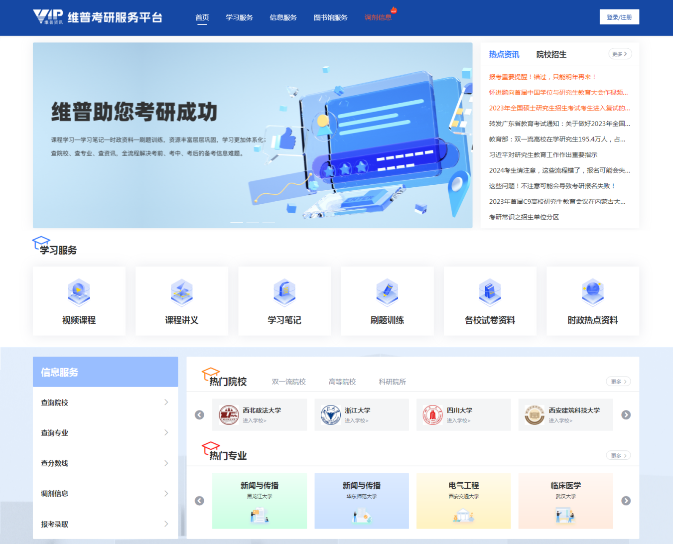 《维普考研服务平台》是一个为图书馆组织机构精心打造的服务考研人群的一站式备考服务应用平台。产品集合了考研学习服务、考研信息服务及图书馆考研专属支撑服务三大核心版块,包含视频课程、学习资料、院校查询、专业查询、考研资讯、考研关联知识、图书馆考研书目推荐等服务内容。产品精准构建了体系化、全过程、一站式的考研服务新场景,是一个具有全方位完善服务体系的考研应用服务平台。