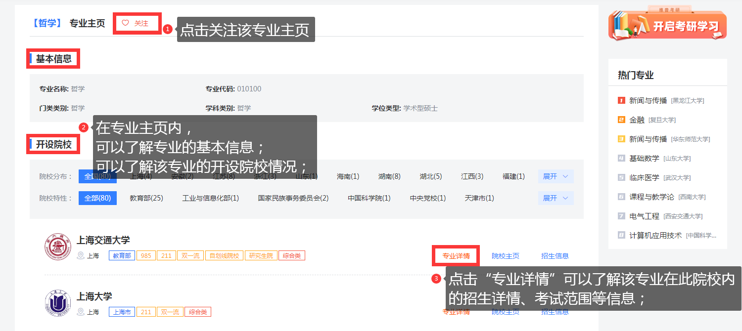产品提供用户科学规范的查询工具,查询了解其感兴趣的研招院校或专业,支持通过院校查询研招专业、通过专业查询其开设院校,通过多维度关系的数据分析,帮助用户了解掌握研招院校的基本情况、硕士专业的基本信息、专业当年招生详情、考试范围等。