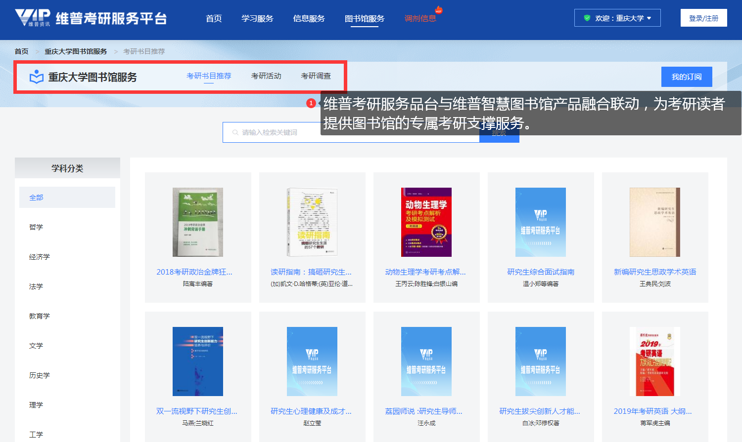 平台提供“图书馆服务”应用,以服务考研人群为终极目标,通过与维普智慧图书馆产品融合联动,帮助考研用户通过机构图书馆,获取到馆内针对考研用户提供的专属支撑服务,内容包括“考研书目推荐、考研活动、考研推荐”,支持用户点击相应栏目的链接跳转至机构图书馆下的内容页面,了解或参与图书馆内有关考研的服务内容。