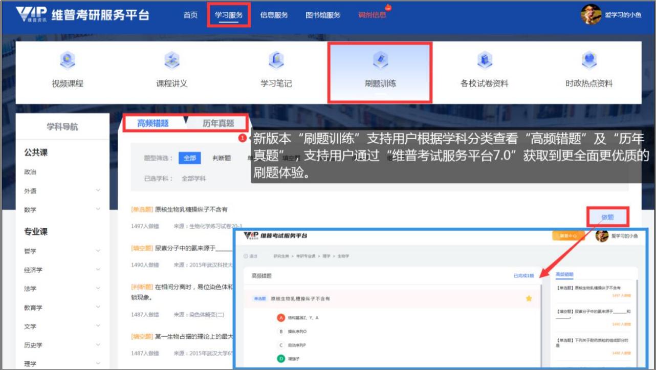 产品全新打造的“学习服务”版块,集成原考研库包含的复习备考所需资源类型,新增了“时政热点资料”模块,支持用户通过“时政新闻、时政试题”积累时政常识;整合了原“试题库、试卷库”并构建成新的“刷题训练”模块,用户点击“做题”“开始考试”即可跳转至“维普考试服务平台7.0”获取更加全面有效的刷题练习服务。“学习服务”包含的视频课程、课程讲义、学习笔记、刷题训练、各校试卷资料及时政热点资料六种资源类型,为考研人群提供了一个进阶式的、体系化的学习服务,帮助用户进行系统连贯的高效复习。