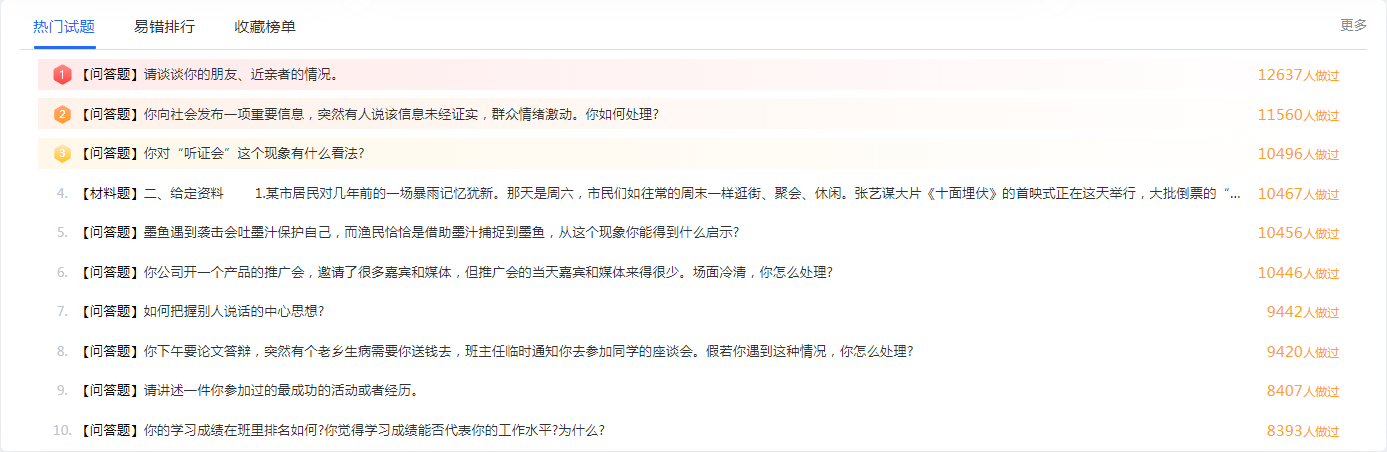 通过平台所有用户的做题数据统计,以试题集合的方式为用户新增提供高频错题、热门试题、收藏榜单三种刷题服务,能够帮助用户在复习时有效把握个人复习水平;