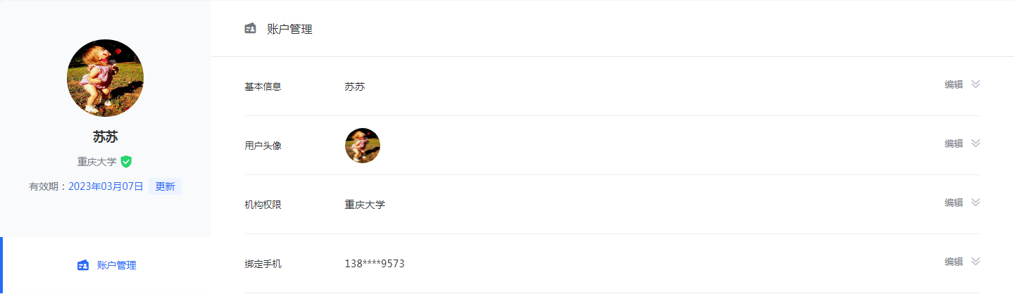 个人中心 用户可在个人中心编辑设置自己的个人资料、账号密码等基础信息;平台还支持用户在机构IP范围内绑定机构、更新有效期,支持有效机构用户在机构IP范围外登录访问。