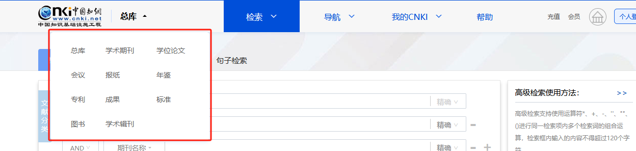 总库提供的检索项有:主题、篇关摘、关键词、篇名、全文、作者、第一作者、通讯作者、作者单位、基金、摘要、小标题、参考文献、分类号、文献来源、DOI。