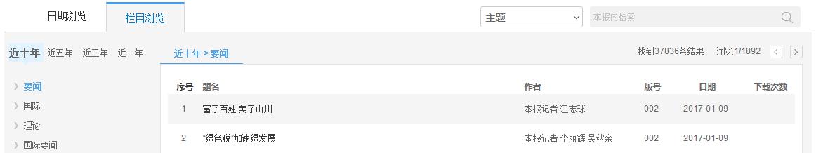 如图5.8.5.2所示,左侧展示该报出版的日期情况。首先选择想要查看的年份,选择后显示该年下的出版月份,鼠标悬停在某月份上,展开该月份的出版日期。点击日期,右侧展示该日期出版的报纸文献,有题名、作者、版号、栏目及下载次数。点击题名,可进入相应知网节;鼠标悬停到某篇文献,点击按钮可下载(登录后)、HTML阅读该篇文献。