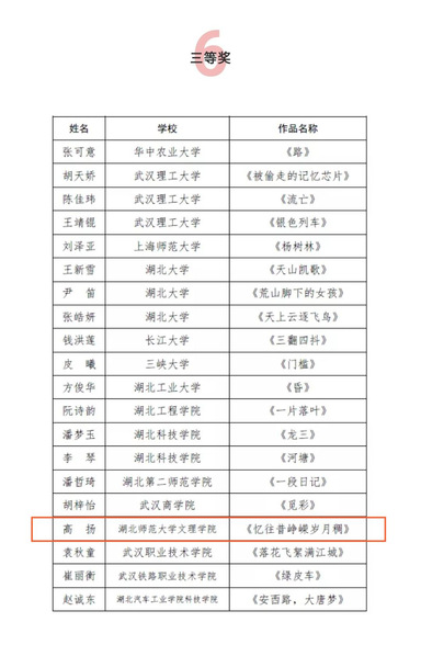 2019年9月湖北省作家协会、湖北省学生联合会联合下发了《关于举办湖北省高校第十八届“福创杯”新青年小说大赛的通知》。大赛自启动以来,我校高度重视、广泛动员,文理学子踊跃报名。其中沈家贤、高扬两人作品打入决赛,榜上有名,展现了8xbet(中国)学生过硬的综合素质,凸显了8xbet(中国)文化育人的工作实效。
