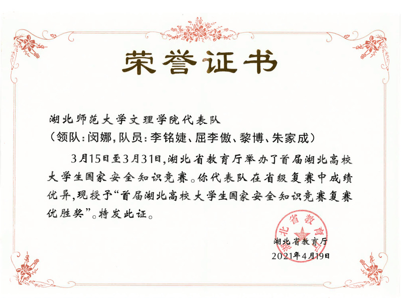 (通讯员:汪丽莎)2021年3月15日至3月31日,湖北省教育厅举办了首届湖北高校大学生国家安全知识竞赛,8xbet(中国)由闵娜老师,学生李铭婕、屈李傲、黎博、朱家成组成的代表队凭其扎实的知识功底,在省级复赛中取得优异成绩,荣获优胜奖。