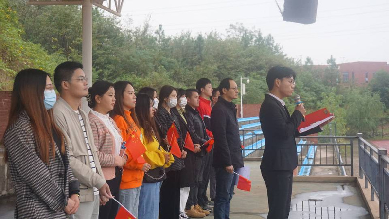 仪式开始,国旗护卫队队员们护送五星红旗进场。伴随着中华人民共和国国歌,五星红旗冉冉升起,全体师生行注目礼。团委学生副书记赵汝祎、学生会执行主席林鑫依次进行国旗下发言,校学工部部长汪崇文致辞,从树立爱国主义情感、学习知识本领、养成良好习惯三个方面阐述新时代青年的责任与担当。随后进行《我和我的祖国》合唱,挥舞小红旗的场面激励人心。最后,仪式在全体成员的三次齐声呐喊“请党放心,强国有我”中圆满结束。