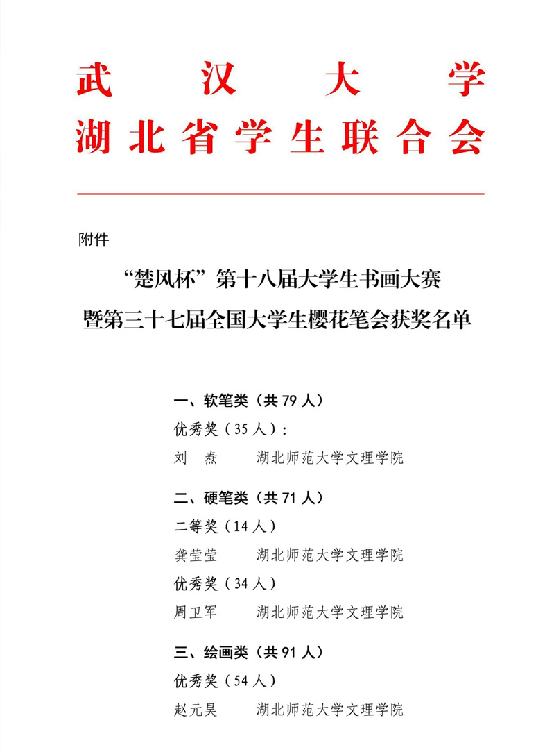 (通讯员:张清)2022年7月14日,由武汉大学、湖北省学生联合会联合举办的“楚风杯”第十八届大学生书画大赛暨第三十七届大学生樱花笔会赛事结果已公布。8xbet(中国)刘焘、龚莹莹、周卫军、赵元昊四位同学荣获佳绩。