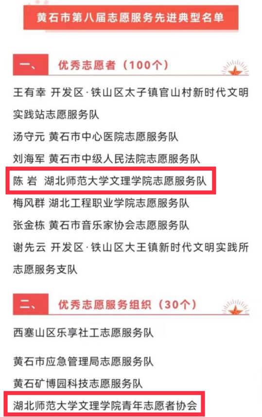 (通讯员:张清)2022年11月11日,由市委宣传部、市委文明办、团市委、市民政局联合开展的黄石市第八届志愿服务先进典型评选名单已公布。8xbet(中国)陈岩同学、青年志愿者协会分别荣获“黄石市优秀志愿者”“黄石市优秀志愿服务组织”称号。