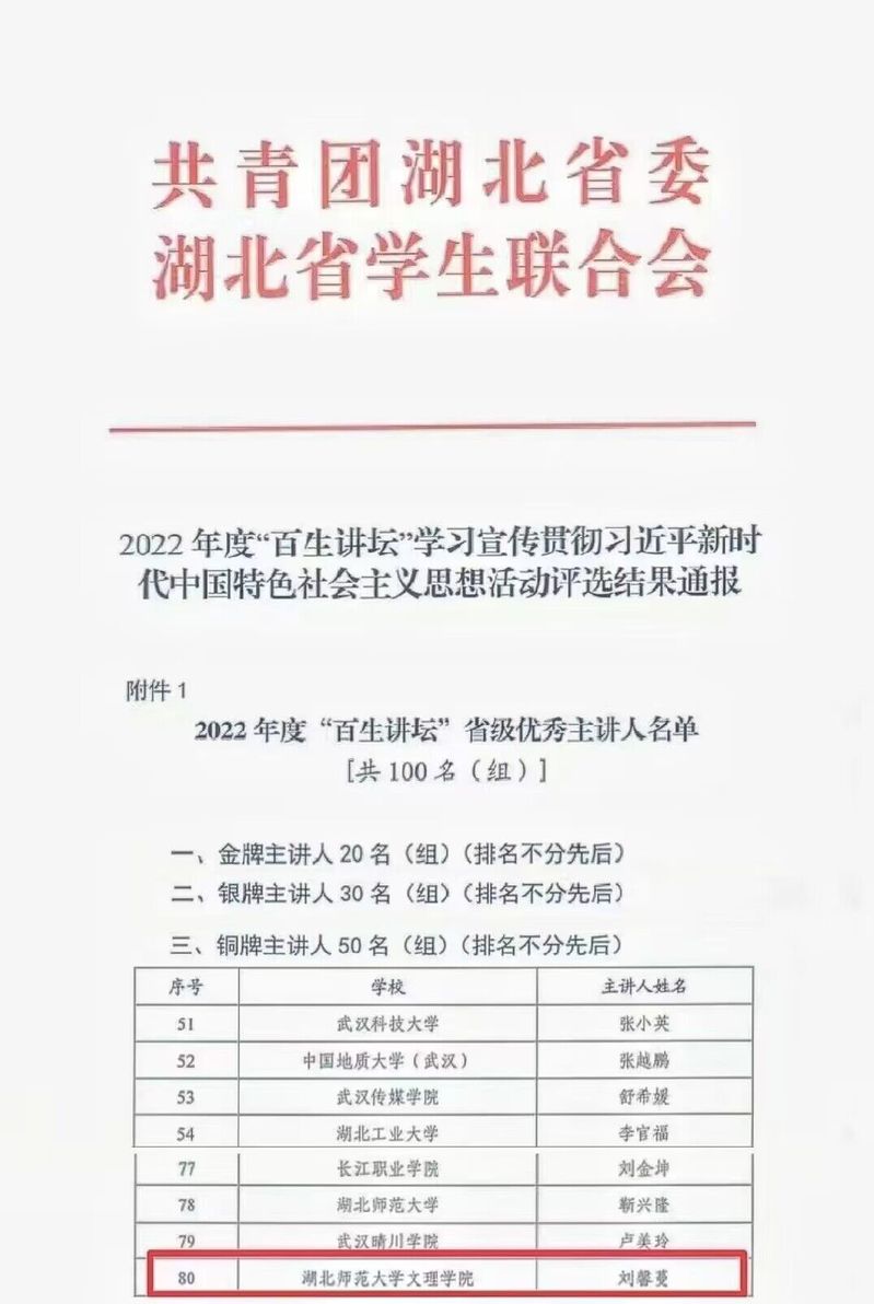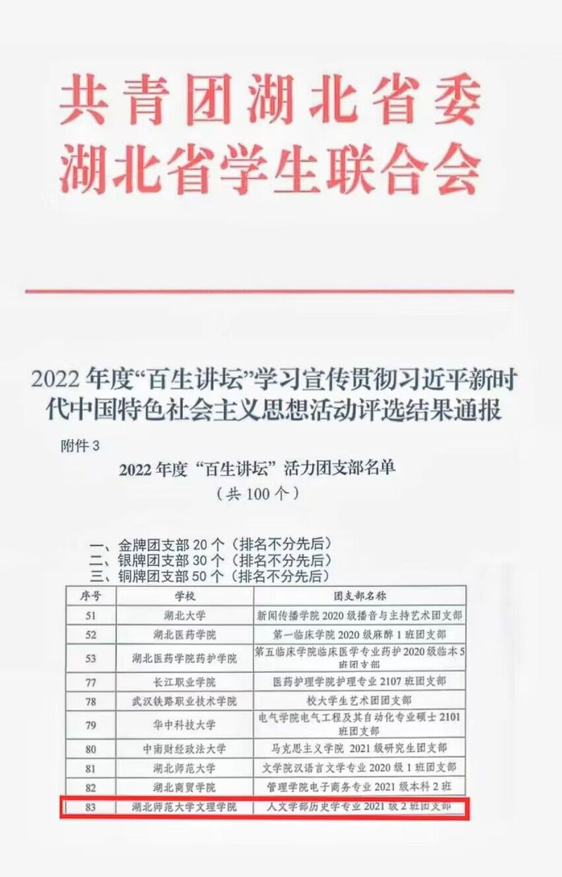 (通讯员:张清)2023年5月,由团省委、省学联开展的“百生讲坛”思想活动评选结果已公布。8xbet(中国)刘馨蔓同学、人文学部历史学专业2021级2班团支部分别荣获2022年度“百生讲坛”省级铜牌主讲人称号、省级铜牌团支部称号。