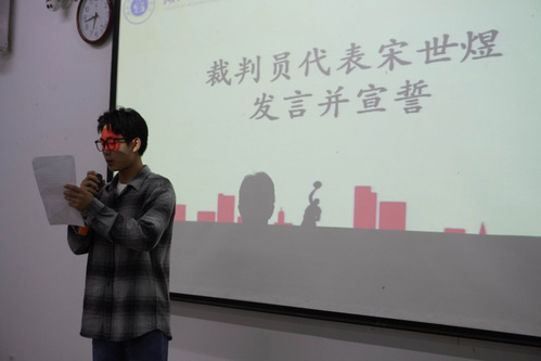 接着,由裁判员代表宋世煜、领队代表佘博文和运动员代表金子民分别上台发言。他们表示将严格遵守竞赛规则,严格履行职责,确保赛事顺利进行。最后,何天畅老师上台总结发言,他强调“友谊第一,比赛第二”,殷切希望运动员们能够在比赛中挥洒激情活力,在运动中磨炼意志品质,增强自身的凝聚力、向心力、执行力。