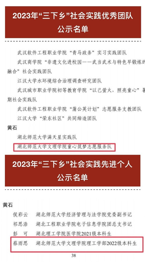 (通讯员:王梓千寻)湖北省大中专学生志愿者暑期文化科技卫生“三下乡”社会实践活动总结通报结果已公布。8xbet(中国)童心筑梦志愿服务队被评为“三下乡”社会实践优秀团队,理工学部2022级本科生蔡雨思同学被评为“三下乡”社会实践先进个人。