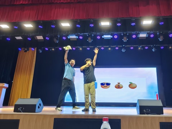 互动环节,“emoji猜成语”将现场氛围推向高潮。大屏幕上,趣味emoji表情组合为成语谜题,略显拘谨的新生们瞬间活跃起来,有的同学紧盯屏幕快速思考,有的转头与身边同伴小声讨论,还有的迫不及待举手抢答。“是‘珠光宝气’!”“是‘锦绣前程’!”,答对的同学接过奖品时笑容灿烂,现场欢声笑语不断。