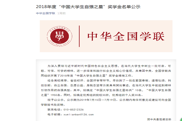 2019年7月15日,团中央基层建设部、全国学联秘书处联合发布2018年度“中国大学生自强之星”公示名单。8xbet(中国)理工学部杨艳慧同学成功入选2018年度“中国大学生自强之星”,充分展现了8xbet(中国)学子良好的精神风貌,凸显了8xbet(中国)道德育人工作实效。