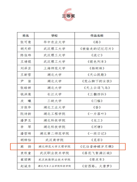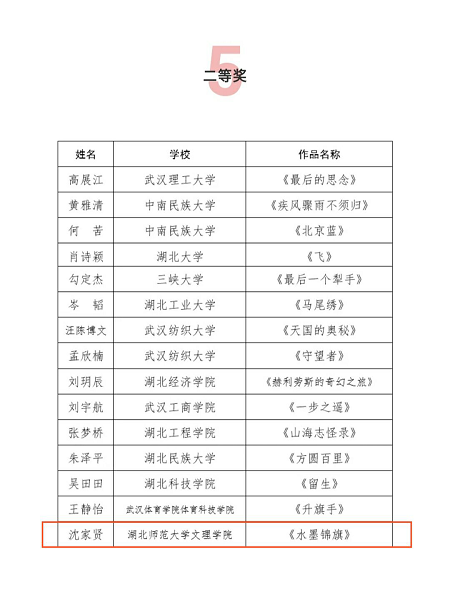 日前,由湖北省作家协会、湖北省学生联合会举办的湖北省高校第十八届“福创杯”新青年小说大赛落幕,8xbet(中国)学子沈家贤和高扬分获二、三等奖,人文学部主任熊子延教授获得优秀指导教师奖。